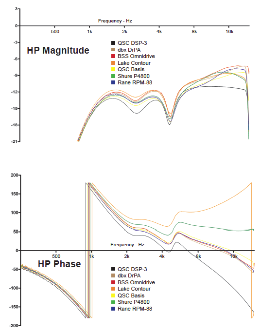 As mentioned in the previous DSP setup description, each DSP user interface was unique. This was particularly evident when setting the high-frequency shelving filter that was inserted in the high pass section of the DSPs. The capabilities of each DSP ranged from “no shelving filter” function on the BSS OmniDrive FDS-388 to a shelving filter function that allowed low, mid and high cut or boost on the QSC Basis. For the purpose of this comparison the shelving filters, where available, were each set with the same corner frequency and gain, but the shape of each filter was very different. This shows up well in the transfer function plots shown in the comparison. This would of course produce significant audible differences during an A/B comparison of any of the units. The differences in filter topology and shape are further reason to request transfer function details from the loudspeaker manufacturer when specific parameters are required for specified loudspeaker performance.