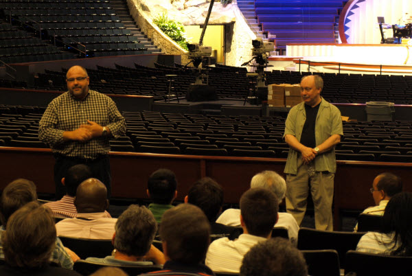 The Houston Operators and Technicians seminar attendees were treated to a site visit to the largest house of worship in the United States – Lakewood Church. The 16,000+ seat venue was once home to the Houston Rockets NBA basketball team. It was converted to an auditorium through an extensive remodeling project that included massive acoustical treatment. The head audio guy at Lakewood is Reed Hall – a technical “jack-of-all-trades” who devoted two evenings to accommodating the Syn-Aud-Con group. He and Brian Tankersly, a Grammy-winning engineer manage the extensive AV department at Lakewood.
