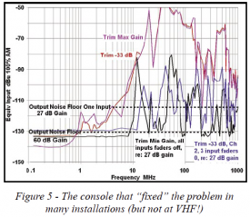 Figure 4 shows test results for a small mixer in a family notorious for picking up AM radio stations. The mixer shown in Figure 5 was designed in response to a chorus of complaints, and it fixed the problem in most installations. But note that while the mixer of Figure 5 is at least 40 dB better on the AM broadcast band, it is at least 30 dB worse in the VHF spectrum, and was thus unusable for my microphone testing in downtown Chicago!